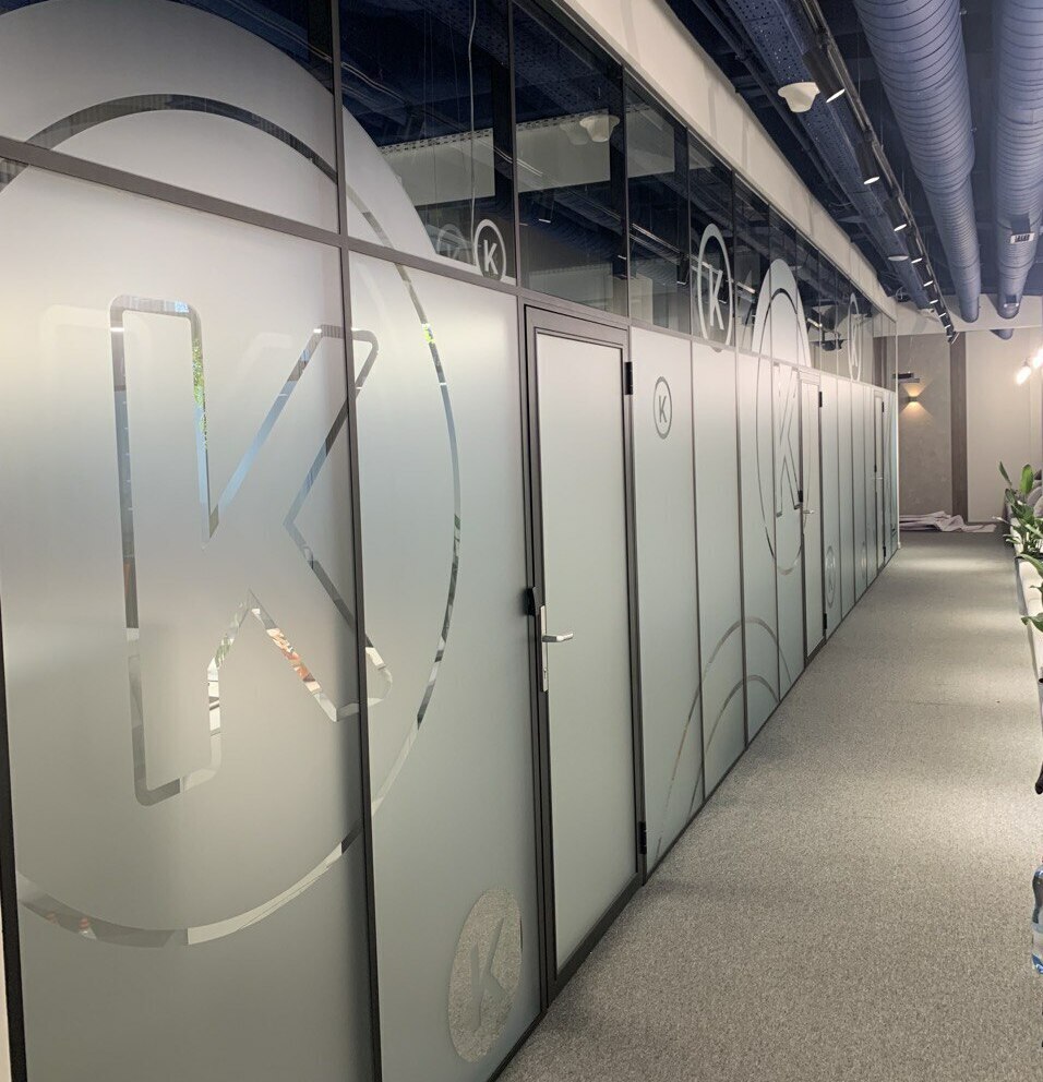 Монтаж плёнок с плоттерной резкой часто применяется на офисных перегородках.